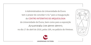A Área de Arqueologia da Universidade de Évora tem o prazer de Vos convidar a estarem presentes na Inauguração do Centro Interactivo de Arqueologia e Inauguração da Exposição de Fotografia: "Arqueologia com Gente Dentro", da autoria dos Professores Jorge de Oliveira, Leonor Rocha e André Carneiro, e que decorrerá no dia 17 de Abril'18 (Terça-feira) na Sala 205 no Palácio do Vimioso.